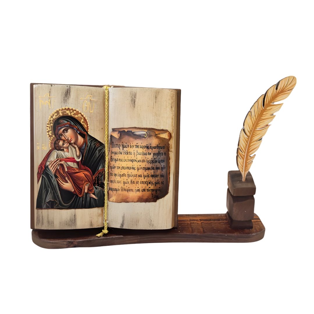Χειροποίητο διακοσμητικό γραφείου με σκούρα ξύλινη βάση και ανοικτό βιβλίο με εικόνα της Υπεραγίας Θεοτόκου και την ευχή «Πάτερ Ημών», συνοδευόμενο από διακοσμητική ξύλινη πένα. Ελληνικό προϊόν, χειροποίητο με ακρυλικά χρώματα και παλαίωση με κερί.